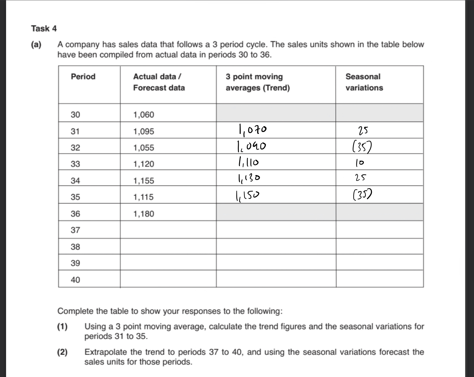 Firstly I completed the trend which keeps on increasing with 20 and then noticed the flow of the Seasonal Variations, started with 25 then -35 and lastly 10,so I carried forward that in the remaining periods.