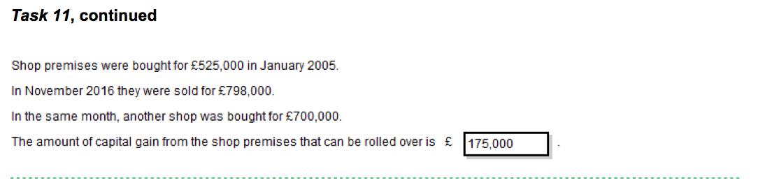 The question is asking what the roll over is. I thought roll over was the amount of gain that can invested in the new replacement. In this case it is 273,000 less the 100,000 difference with the new shop being cheaper than the one sold. This gives me an answer of 173,000 but the answer says it is 175,000.